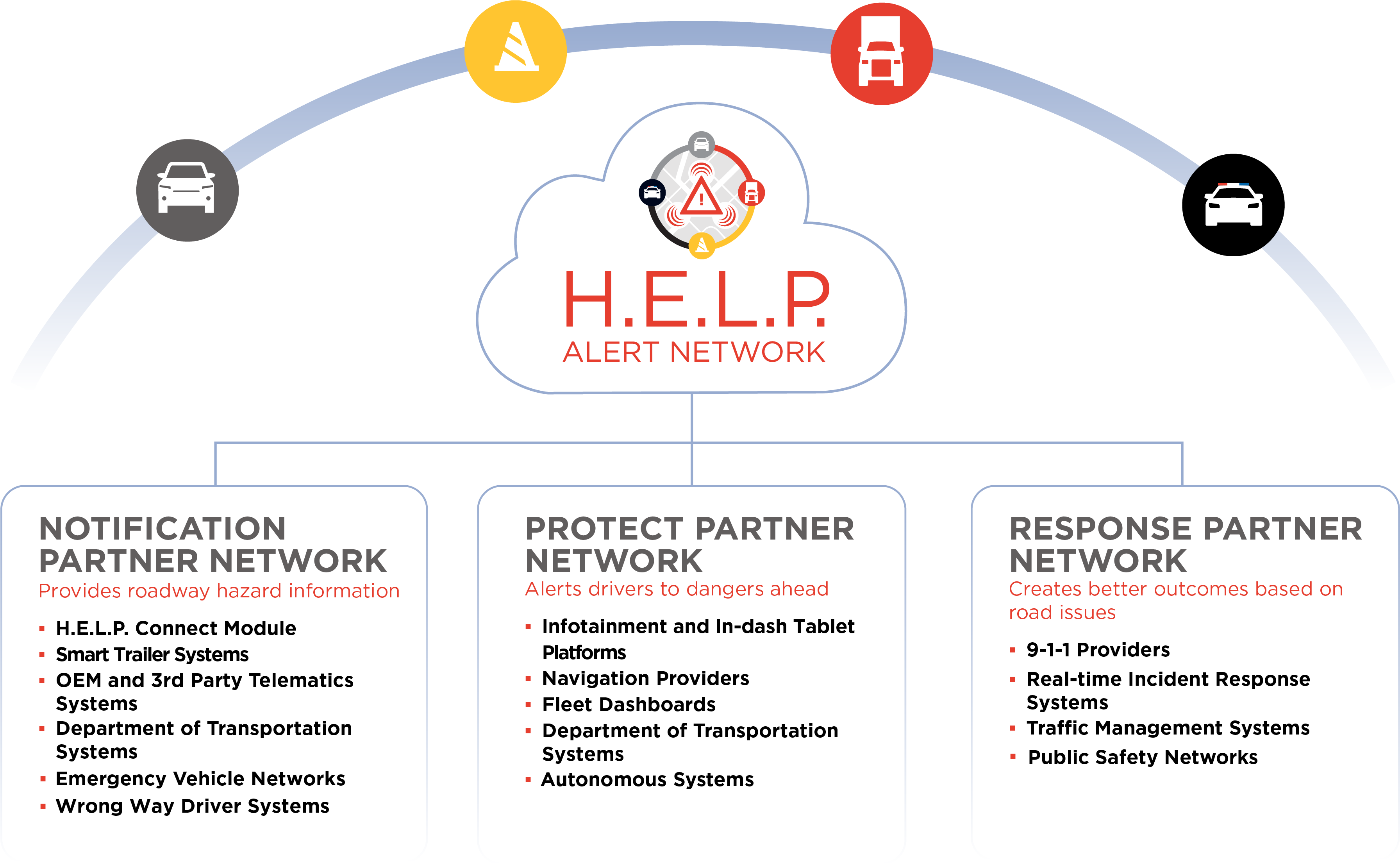 The H.E.L.P.® Alert Network™ is a next-generation safety platform that transforms the way roadway hazards are detected, shared, and acted upon. It collects, analyzes, and distributes critical hazard data from commercial fleets, connected vehicles, work zones, infrastructure, and emergency systems - empowering more timely decisions and safer outcomes for everyone on the road.